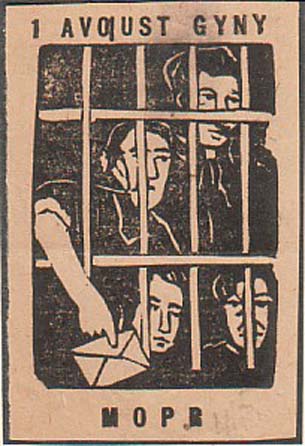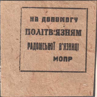 1932 г. 25.08.1932 г. Разм. 50 х 50 мм. Одноцветная печать на толстой желто-серой бумаге. В центре в прямоугольной рамке разм. 36 х 37 мм текст в три строки на украинском языке: «В помощь политзаключенным Радомской тюрьмы». В правом нижнем углу аббревиатура «МОПР».