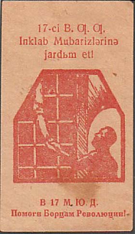 1932 г. 01.05.1932 г. Разм. 56 х 81 мм. Одноцветная печать на желто-серой бумаге. В центре четверо заключенных, один из которых протягивает письмо через решетку. Сверху и снизу текст на азербайджанском языке латинским шрифтом.