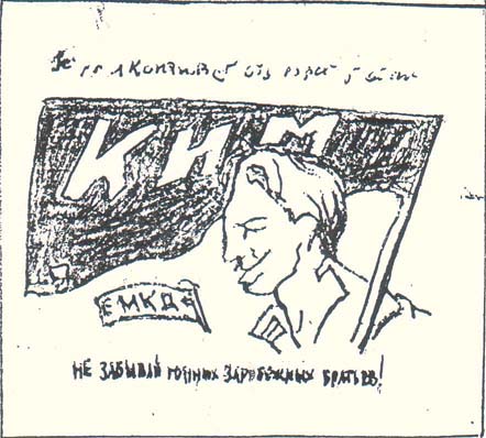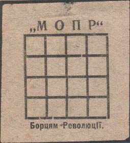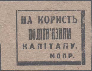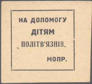 1932(?) г. Разм. 53 х 48 мм. Одноцветная печать на желто-серой бумаге. В центре в прямоугольной рамке разм. 37 х 36 мм текст на украинском языке в три строки: «На помощь детям политзаключенных». В правом нижнем углу аббревиатура «МОПР».