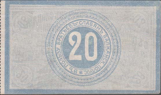 1912 г. Листок из квитанционной книжки разм. рамки 86 х 49 мм. Одноцветная двухсторонняя печать на белой бумаге. Правосторонняя зубц. 11 1/2. На лицевой стороне в тройной прямоугольной рамке аллегорический рисунок : четыре фигуры с мечами, символизирующие балканские славянские государства возле лежащих турецких знамен на фоне города с минаретами. Слева оливковая ветвь и флаг с текстом на полотнище: «Славянский союз». Сверху тест в три строки: «В пользу братьев славян Балканского полу-острова». По углам в двойных круглых рамках номинал. На оборотной стороне в центре на фоне в виде сетки в круглой декоративной рамке из концентрических окружностей номинал. По периметру между рамками текст: «В пользу братьев-славян Балканск[ого]. Полу-ос[трова].».