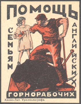 1926 г. Разм. 45 х 60 мм. Двухцветная печать на кремовой бумаге. В центре шахтер, опирающийся на кирку и девочка с цветами. По периметру текст: «Помощь семьям английских горнорабочих». Слева внизу выходные данные мелким шрифтом: «Хромо-лит. Уралполиграфа».