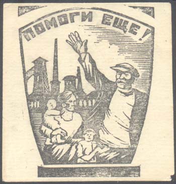 1926 г. 1926 г. Разм. 53 х 60 мм. Одноцветная печать на бумаге различных цветов и качества. В центре в рамке сложной формы разм. 45 х 52 мм шахтер с поднятой рукой и женщина с двумя детьми на фоне угольной шахты. Сверху полукругом текст: «Помоги еще!».