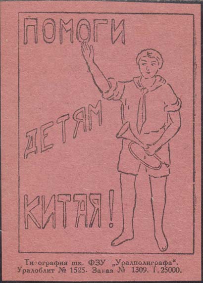 1930(?) г. Разм. 63 х 93 мм. Одноцветная печать на светло-карминово-красной бумаге. В прямоугольной рамке разм. 52,5 х 72 мм справа пионер с горном и поднятой правой рукой. Слева текст в три строки: «Помоги детям Китая!». Внизу мелким шрифтом выходные данные в две строки: «Типография шк. ФЗУ «Уралполиграфа», Уралоблит №1525. Заказ №1309. Т. 25000».