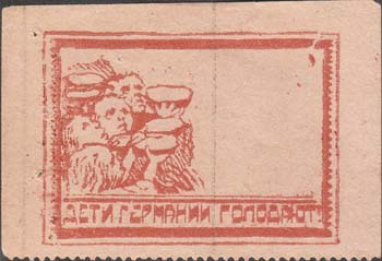 1930(?) г. Разм. 60 х 43 мм. Одноцветная печать низкого качества на серо-синей бумаге. В двойной прямоугольной декоративной рамке разм. 50 х 36 мм слева группа детей с протянутыми тарелками. Внизу текст: «Дети Германии голодают».