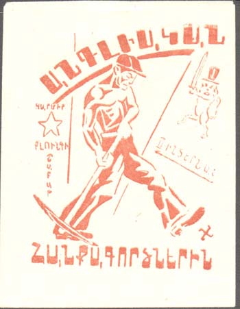 1930(?) г. Разм. 70 х 48 мм. Одноцветная печать на бумаге различных цветов. В центре текст в четыре строки: «Выше знамя мировой пролетарской солидарности!».