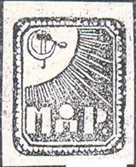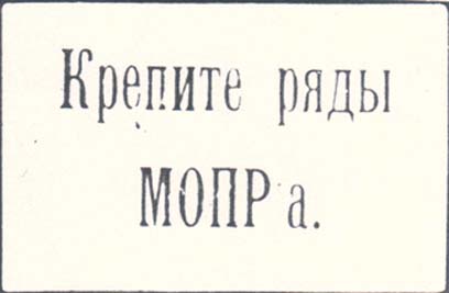 1924 г. Разм. 44 х 54 мм. Двухцветная печать низкого качества на светло-желтой бумаге. В декоративной рамке разм. 38 x 46 мм с закругленными углами в левом верхнем углу серп и молот на солнечном диске. Внизу в лучах солнца аббревиатура: «МОПР».