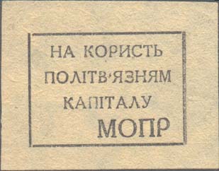 1932 г. 01.09.1932 г. Разм. 50 х 40 мм. Одноцветная печать на тонкой светло-желтой бумаге. В центре в прямоугольной рамке разм. 39 х 31,5 мм текст в три строки на украинском языке: «В пользу политзаключенных капитала». В правом нижнем углу аббревиатура «МОПР».