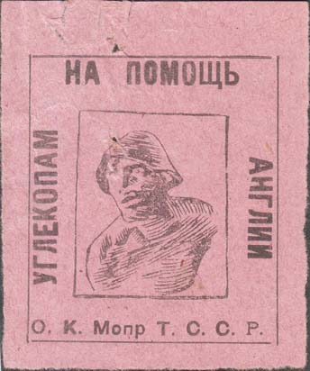 1926 г. Разм. 56 х 65 мм. Одноцветная печать на плотной розовой бумаге. В двойной прямоугольной рамке разм. 47 х 53 мм в центре фигура шахтера. По периметру между рамками текст: «На помощь углекопам Англии О.К. МОПР Т.С.С.Р.».