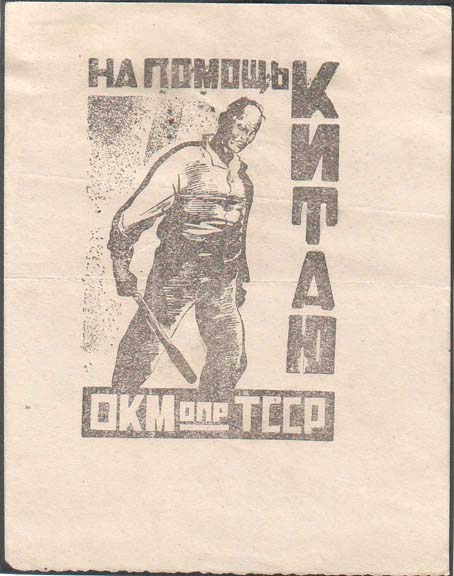 1926 г. Разм. 76 х 95 мм. Одноцветная печать на белой бумаге. В центре китайский рабочий с палкой в правой руке. По периметру текст: «На помощь Китаю. ОК МОПР ТССР».