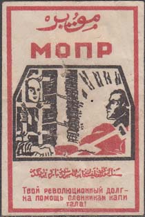 1926(?) г. Разм. рамки 32 х 50 мм. Двухцветная печать на толстой желтоватой бумаге. В прямоугольной рамке в центре эмблема МОПР. Сверху аббревиатура на татарском (арабским шрифтом) и русском языках: «МОПР». Внизу текст в две строки на татарском (арабским шрифтом) и русском языках: «Твой революционный долг – на помощь пленникам капитала!».