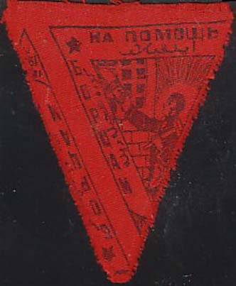 1927 г. 18.03.1927 г. Виньетка в форме перевернутого треугольника разм. 58 х 68 мм. Одноцветная печать на красной материи. В двойной треугольной рамке в центре рабочий с молотом протягивает руку заключенному через решетку. По периметру текст на русском и татарском (арабским шрифтом) языках: «На помощь борцам революции». Внизу дата в три строки: «18/III 1927 г.».