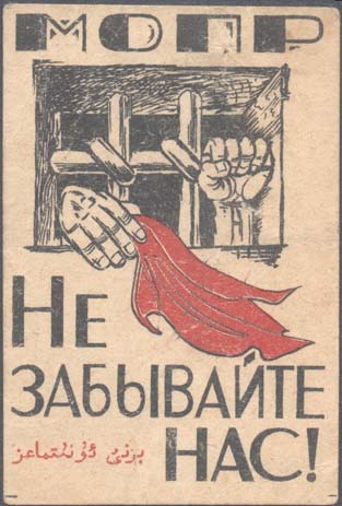 1930(?) г. Разм. 52 х 77 мм. Двухцветная печать на толстой кремовой бумаге. В центре эмблема МОПР. Сверху аббревиатура «МОПР». Внизу текст в три строки: «Не забывайте нас!». Слева внизу текст на татарском языке арабским шрифтом.