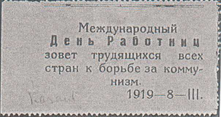 1919 г. 08.03.1919 г. Разм. по перфорации 74 х 41 мм. Одноцветная печать на тонкой бледно-розовой бумаге. Зубц. 11 1/2. В центре текст в шесть строк: «Международный День Работниц зовет трудящихся всех стран к борьбе за коммунизм. 1919-8-III».
