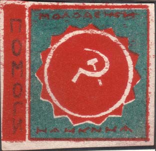 1926 г. Разм. 53 х 48 мм. Двухцветная печать на плотной белой бумаге. Слева вертикальная полоса разм. 8 х 46 мм с текстом: «Помоги». Справа в прямоугольной рамке разм. 40 х 46 мм в центре многолучевая звезда с серпом и мо-лотом в круглой рамке. Сверху продолжение текста «Молодежи». Внизу продолжение текста: «Нанкина».
