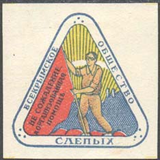 1926 г. 01.121926 г. Республиканский сбор. Разм. 38 х 38 мм. Многоцветная печать на белой бумаге. В двойной треугольной рамке с закругленными краями на фоне восходящего солнца и заводов слепой держит флаг, на котором текст: «Не сожаление, а организованная помощь». По периметру рамки текст: «Всекрымское общество слепых».