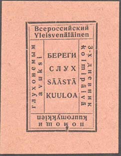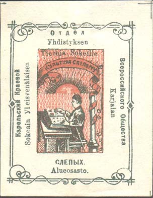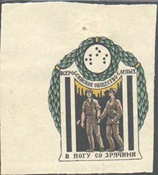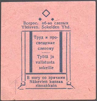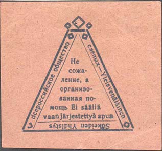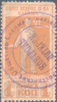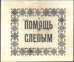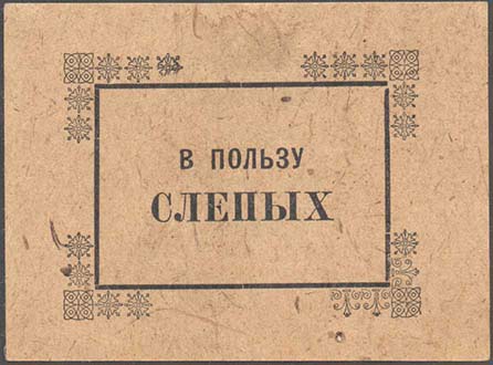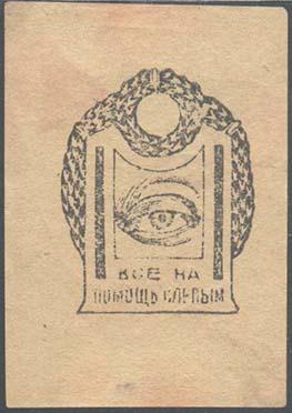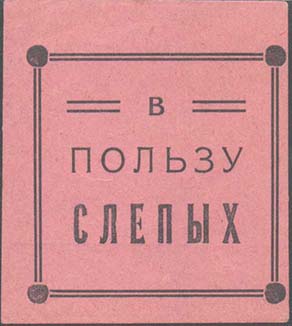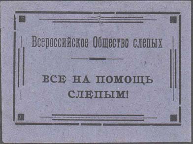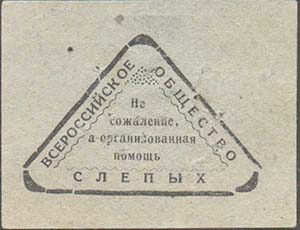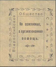 1926 г. Разм. 44 х 56 мм. Одноцветная печать на бумаге различных цветов. В фигурной рамке с орнаментом в углах разм. 36 х 44 мм тонкая прямоугольная рамка. Между рамками текст: «Всероссийское общество слепых». В центре в три строки текст: «Не сожаление, а организованная помощь».