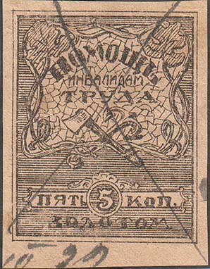 1925(?) г. Разм. рамки 44 х 55 мм. Одноцветная печать на кремовой бумаге. В центре на фоне растительного орнамента и скрещенных якоря и топора текст в три строки: «В помощь инвалидам труда». Внизу номинал в золотой валюте.