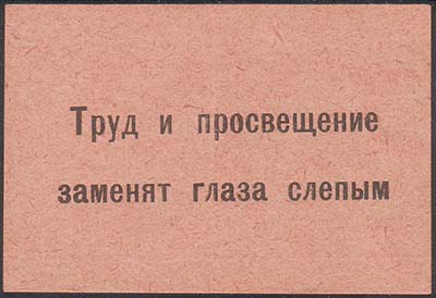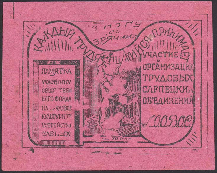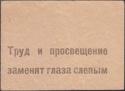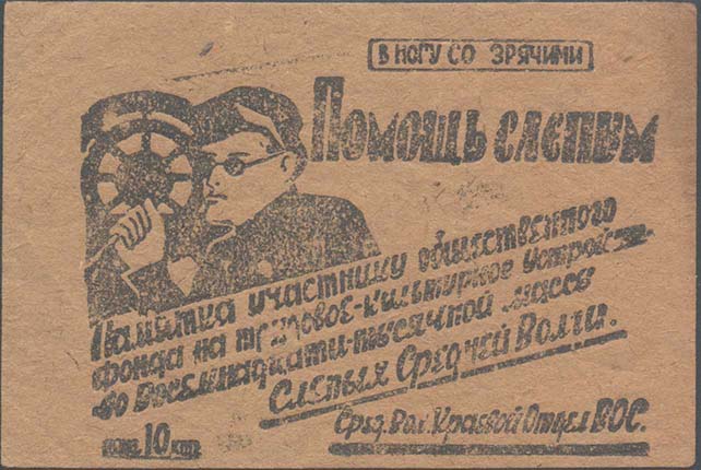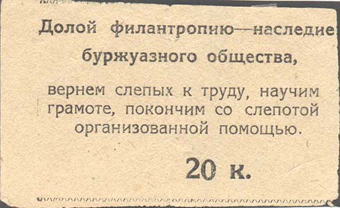 1933 г. Март Разм. 64 х 52 мм. Одноцветная печать на плотной желтой бумаге. Сверху и снизу две волнистые линии. В центре текст в пять строк: «Долой филантропию – наследие буржуазного общества, вернем слепых к труду, научим грамоте, покончим со слепотой организованной помощью». Внизу номинал «20 к.».
