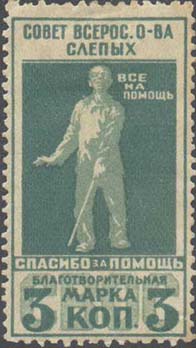 1925 г. Разм. рамки 21,5 х 39, 5 мм. Двухцветная печать на белой бумаге. Зубц. 12: 12 1/2. С клеем. В центре на цветном фоне слепой с тростью и текст в три строки «Все на помощь». Сверху текст две строки: «Совет всерос[сийского]. О-ва Слепых». Внизу текст в одну строку: «Спасибо за помощь». Ниже на фоне больших букв: «СВОС» текст в две строки: «Благотворительная марка» и номинал.