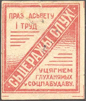 1931(?) г. Разм. 48 х 55 мм. Одноцветная печать на желто-ватой бумаге. В двойной прямоугольной рамке в левом верхнем углу тест в две строки на белорусском языке: «Через просвещение и труд». В правом нижнем углу продолжение теста в три строки на белорусском языке: «Вовлечем глухонемых в социалистическое строительство». По диагонали в центре снизу вверх текст: «Берегите слух!».