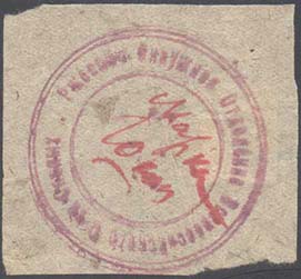1928(?) г. Разм. 45 х 45 мм. Одноцветная печать на сероватой бумаге. В центре оттиск круглой печати с текстом по окружности: «Ржевское Окружное Отделение Всероссийского Общества Слепых». В центре в две строки текст от руки: «Марка 10 коп.».