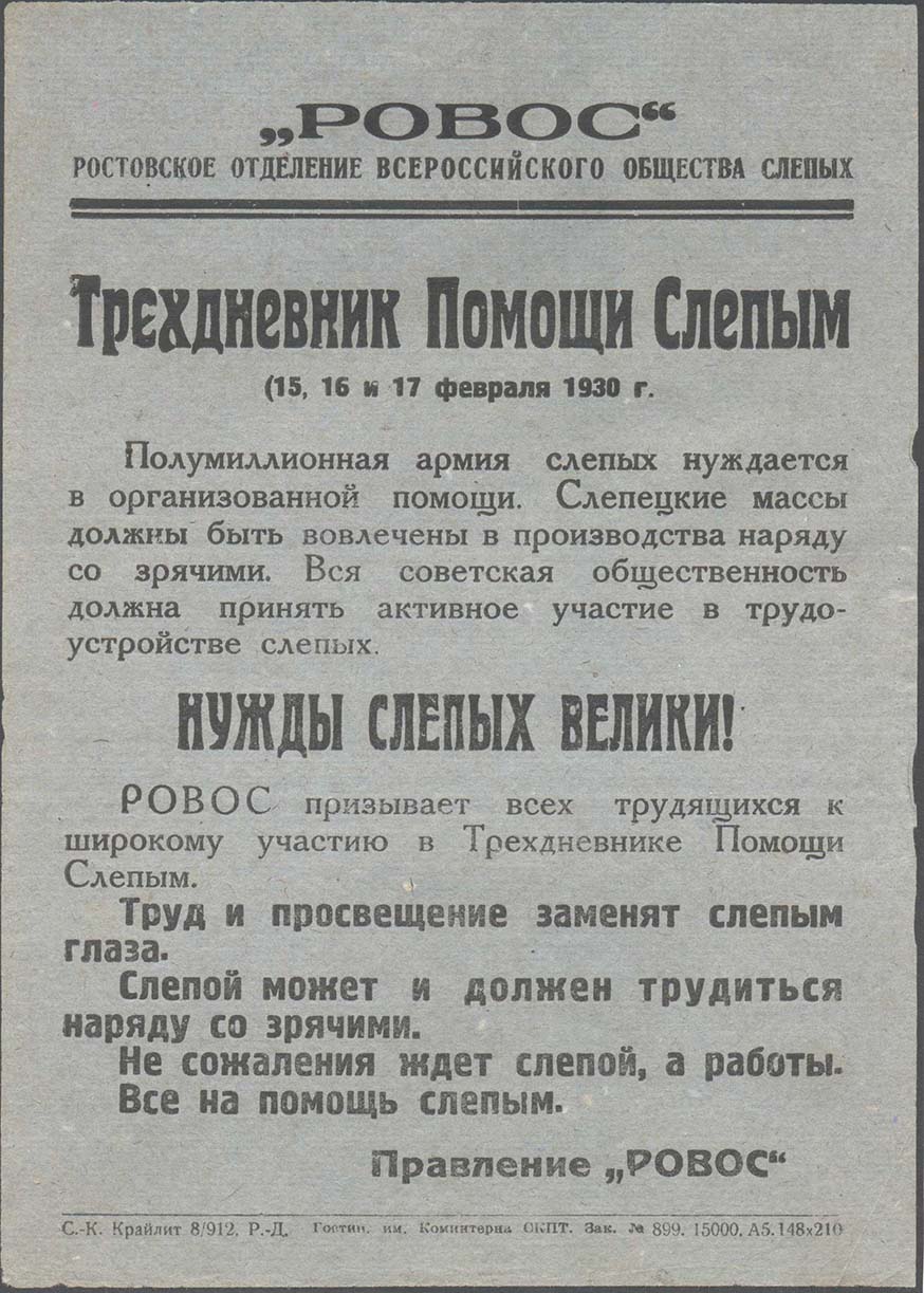 1930 г. 15.-17.02.1930 г. Городской сбор. Листок разм. 146 х 206 мм. Одноцветная печать на бумаге различных цветов. В центре текст в девятнадцать строк: «Трехдневник помощи слепым (15, 16 и 17 февраля 1930 г.). Полумиллионная армия слепых нуждается в организованной помощи. Слепецкие массы должны быть вовлечены в производства наряду со зрячими. Вся советская общественность должна принять активное участие в трудоустройстве слепых. Нужды слепых велики! РОВОС призывает всех трудящихся к широкому участию в Трехдневнике Помощи Слепым. Труд и просвещение заменят слепым глаза. Слепой может и должен трудиться наряду со зрячими. Не сожаления ждет слепой, а работы. Правление «РОВОС»». Сверху над двойной горизонтальной чертой текст в две строки: ««РОВОС»» Ростовское отделение всероссийского общества слепых». Внизу под горизонтальной чертой выходные данные мелким шрифтом: «С.-К. Крайлит 8/912. Р.-Д. Гостип. Им. Коминтерна СКТП. Зак. №899. 15000. А5. 148 х 210».