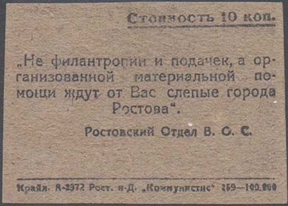 1930(?) г. Городской сбор. Разм. 70 х 49 мм. Одноцветная печать на плотной серо-коричневой бумаге. В центре текст в четыре строки: «Не филантропии и подачек, а помощи ждут от вас слепые города Ростова». Ниже текст: «Ростовский отдел В.О.С.». В правом верхнем углу номинал с подчеркиванием. Внизу выходные данные мелким шрифтом: «Крайл. А-3572 Рост. н.-д. «Коммунист» 259 – 100.000. На обороте текст обращения М.И.Калинина.».