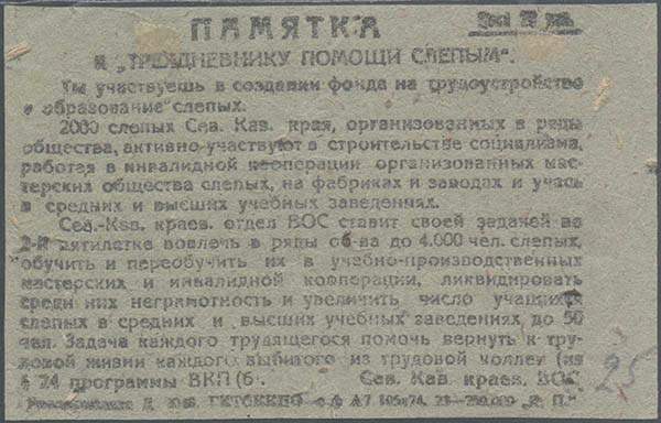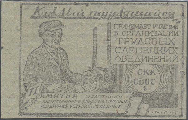 1932 г. Областной сбор. Разм. рамки 88 х 60 мм. Двухсторонняя од-ноцветная печать на бумаге различных цветов. В двойной тонкой прямоугольной рамке слепой у станка. Сверху и справа текст в шесть строк: «Каждый трудящийся принимает участие в организации трудовых слепецких объединений». Внизу на ленте текст: «Памятка участнику общественного фонда на трудовое культурное устройство слепых». Справа в круглой рамке аббревиатура «СККОВОС». Справа внизу номинал: «Цена 20 коп.». На оборотной стороне фрагмент речи М.И.Калинина и выходные данные мелким шрифтом.
