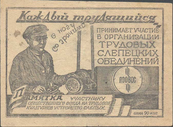 1931 г. Областной сбор. Разм. рамки 103 х 72 мм. Двухсторонняя одноцветная печать на бумаге различных цветов. В двойной тонкой прямоугольной рамке слепой у станка. Сверху и справа текст в шесть строк: «Каждый трудящийся принимает участие в организации трудовых слепецких объединений». Сверху у головы рабочего по диагонали текст в две строки: «В ногу со зрячими». Внизу на ленте текст: «Памятка участнику общественного фонда на трудовое культурное устройство слепых». Правее номинал: «Цена 20 коп.». На оборотной стороне фрагмент речи М.И.Калинина и выходные данные мелким шрифтом.