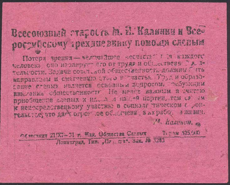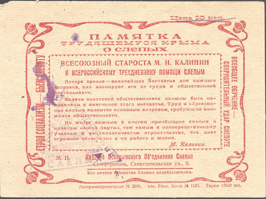 1931 г. Республиканский сбор. Листок разм. 148 х 110 мм. Одноцветная печать на желтоватой бумаге. В центре в декоративной рамке из растительного орнамента дополнительная прямоугольная рамка разм. 96 х 53 мм. В прямоугольной рамке сверху текст в две строки: «Всесоюзный староста М.И.Калинин к Всероссийскому трехдневнику помощи слепым». В центре текст обращения в двенадцать строк: «Потеря зрения – величайшее несчастье для каждого человека, оно изолирует его от труда и общественной деятельности». Задачи советской общественности должны быть направлены к смягчению этого несчастья. Труд и образование слепых являются основным вопросом, требующим внимания общественности. Не менее важным я считаю приобщение слепых к идеям нашей партии, тем самым к непосредственному участию в социалистическом строительстве, что дает огромное облегчение в их работе и жизни. М.Калинин». Сверху между рамками текст в три строки: «Памятка трудящемуся Крыма о слепых». Слева между рамками вертикально текст: «Строя социализм – бьем слепоту». Справа между рамками текст в две строки: «Всеобщее обучение – сокрушительный удар по слепоте». Внизу между рамками текст в три строки: «М.П. Издание Всекрымского Объединения Слепых. Симферополь, Севастопольская ул., 6. Без печати Общества Слепых недействителен». Внизу под рамкой мелким шрифтом выходные данные: «Литкрымнаркомпроса №2341. Тип. Рика. Заказ №1135. Тираж 17000 экз.». Сверху в правом углу номинал: «Цена 10 коп.». В левом нижнем углу фиолетовый оттиск треугольной печати с неразборчивым текстом.