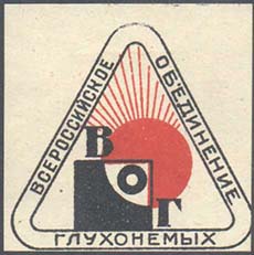 1927(?) г. Разм. 38 х 38 мм. Двухцветная печать на белой бумаге. В двойной треугольной рамке с закругленными краями в центре квадрат на фоне солнца и аббревиатура «ВОГ». По периметру между рамками текст: «Всероссийское объединение глухонемых».