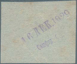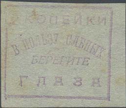 1929 г. 16.12.1929 г. Разм. рамки 36 х 32 мм. Одноцветная печать на тонкой серо-синей бумаге низкого качества. В рамке сверху номинал. Ниже текст в три строки: «В пользу слепых. Берегите глаза».