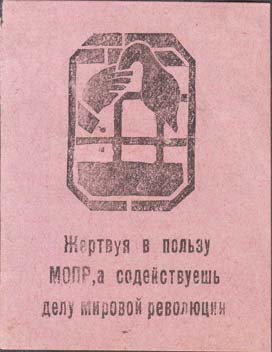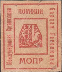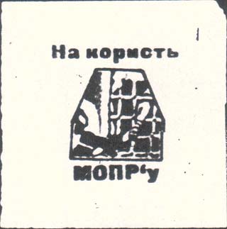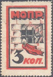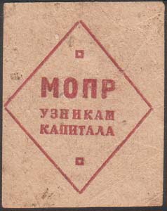 1923 г. Разм. 38 х 48 мм. Одноцветная печать на тонкой желтоватой бумаге. Зубц. 11 1/2 и Б.З. В центре в прямоугольной рамке разм. 29 х 39 мм эмблема МОПР. Сверху текст в три строки: «МОПР Межд[ународная]. Орган[изация]. Помощи борцам революции». Внизу текст в две строки: «Твой революционный долг – на помощь пленникам капитала!». Внизу номинал: «Цена ... руб.». Слева внизу мелким шрифтом выходные данные: «1-я Гостип. Одесса».