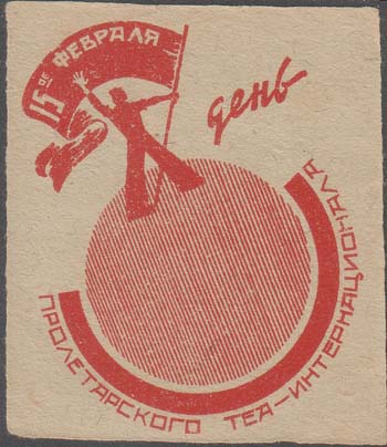 1931 г. 15-20.06.1931 г. Разм. 58 х 67 мм. Одноцветная печать на желтоватой бумаге. В центре символическое изображение земного шара и рабочего с красным флагом. На флаге текст на украинском языке: «15-го февраля». По окружности продолжение текста на украинском языке: «День пролетарского теа-интернационала». (О).
