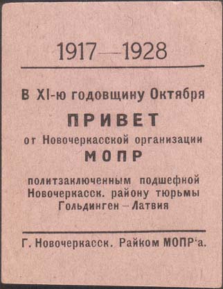 1928 г. Разм. 54 х 70 мм. Одноцветная печать на бумаге различных цветов. В центре текст в семь строк: «В XI-ю годовщину Октября Привет от Новочеркасской организации МОПР политзаключенным подшефной Новочеркасск[ому]. району тюрьмы Гольдиген - Латвия». Сверху над вертикальной чертой текст: «1917 - 1928». Внизу под вертикальной чертой текст: «Г. Новочеркасск. Райком МОПРа».