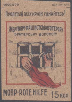 1930(?) г. Разм. 40 х 56 мм. Двухцветная печать на серо-желтой бумаге-отходах обойного производства. В центре в прямоугольной рамке разм. 34 х 36 мм эмблема МОПР. Сверху внутри рамки текст в две строки на украинском языке: «Жертвам фашистского террора братскую помощь». Сверху над рамкой текст на украинском языке: «Пролетарии всех стран, соединяйтесь!». Внизу под рамкой текст: «МОПР – RОTE HILFE». В правом нижнем углу номинал. Внизу мелким шрифтом неразборчиво выходные данные.