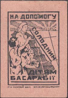 1930(?) г. Разм. 37 х 53 мм. Одноцветная печать на светло-розовой бумаге с вкраплениями серых волокон. В прямоугольной рамке разм. 29 х 41 мм аллегорический рисунок: группа детей на фоне карты Бессарабии. Из-за горизонта всходит солнце с аббревиатурой на диске «СССР». Текст в четыре строки на украинском языке: «На помощь голодным детям Бессарабии». Внизу под рамкой мелким шрифтом неразборчиво выходные данные.