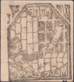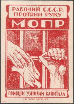 1929 г. Разм. 44 х 58 мм. Двухцветная печать на желто-коричневой бумаге. В центре в прямоугольной рамке эмблема МОПР. Сверху текст в четыре строки: «Обед политзаключенному пролетарию стоит 50 копеек».