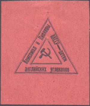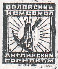 1926(?) г. Разм. 27 х 31 мм. Одноцветная печать на светло-серо-желтой бумаге. В рамке разм. 22 х 25 мм шахтерская лампа и кирка на фоне солнца с лучами. Сверху текст в две строки: «Орловский комсомол». Внизу продолжение текста в две строки: «Английским горнякам». Внизу под рамкой выходные данные мелким шрифтом: «Лит. «Труд» Орел».