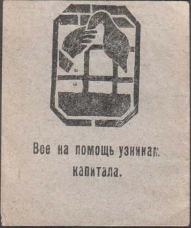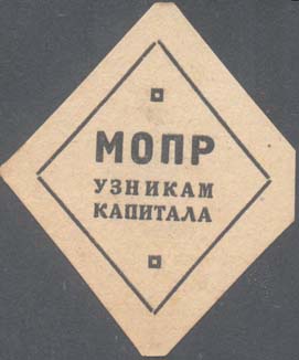1929 г. 28.04.1929 г. Разм. 40 х 50 мм. Одноцветная печать на плотной кремовой бумаге. В центре в рамке в форме ромба разм. 36 х 42 мм в центре текст в три строки: «МОПР узникам капитала». Сверху и снизу декоративные элементы.