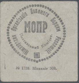 1931 г. 07.11.1931 г. Разм. 46 х 48 мм. Одноцветная печать на серо-зеленой бумаге. В центре в круглой декоративной рамке диаметром 35 мм текст в две строки на украинском языке: «МОПР Полтавский Комитет». По внутреннему периметру рамки текст на украинском языке: «Международная Организация Помощи Борцам Революции». Внизу мелким шрифтом выходные данные на украинском языке: «№1338. Горлит 509».