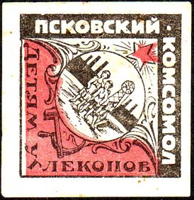 1926 г. 08.08.1926 г. Ромб разм. рамки 55 х 55 мм. Одноцветная и двухцветная печать на плотной белой (оттенки) бумаге. В центре в круглой рамке женщина и двое детей на фоне угольной шахты. Сверху пятиконечная звезда с лучами. Внизу серп и молот. По внутреннему периметру таки текст: «Псковский комсомол детям углекопов».