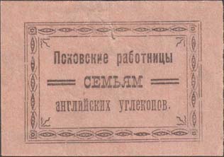 1926 г. Разм. 52 х 37 мм. Одноцветная печать на розово-серой бумаге. В двойной прямоугольной рамке текст в три строки: «Псковские работницы семьям английских углекопов».