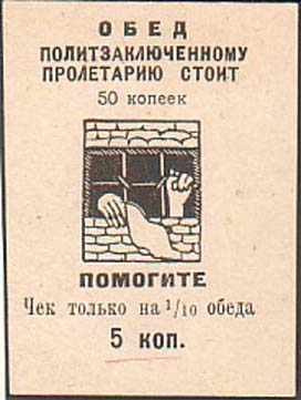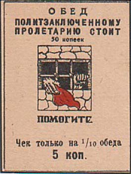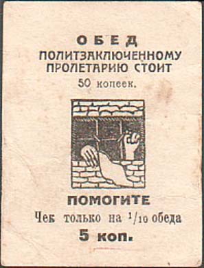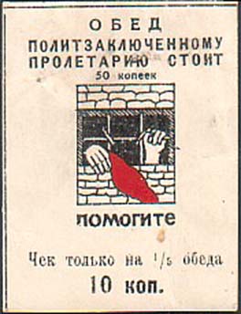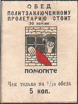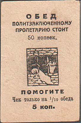 1929 г. Разм. 44 х 69 мм. Одноцветная печать на желтоватой бумаге. В центре в прямоугольной рамке эмблема МОПР. Сверху текст в четыре строки: «Обед политзаключенному пролетарию стоит 50 копеек». Внизу текст в три строки: «Помогите. Чек только на 1/10 обеда 5 коп.».