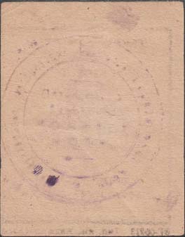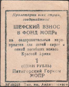 1930(?) г. Разм. 40 х 55 мм. Одноцветная печать на плотной желтоватой бумаге. В прямоугольной рамке разм. 40 х 46 мм текст в двенадцать строк: «Пролетарии всех стран, соединяйтесь! Шефский взнос в фонд МОПРа. На оздоровительные мероприятия для детей-сирот семей погибших воинов Красной Армии. 1 (Один рубль). Пятигорский Горком МОПР». Внизу под рамкой мелким шрифтом выходные данные: «ВГ-05218. Тип. Им. Анджиевского». На оборотной стороне фиолетовый оттиск круглой контрольной печати диаметром 41 мм с неразборчивым текстом.