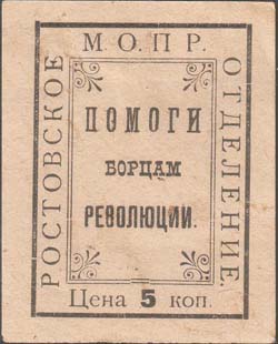 1926(?) г. Разм 40 х 53 мм. Одноцветная печать на плотной кремовой бумаге. В двойной прямоугольной рамке в центре текст в три строки: «Помоги борцам революции». По периметру между рамками текст: «М.О.П.Р. Ростовское отделение. Цена 5 коп.».