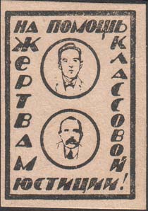 1927 г. Сентябрь. Разм рамки 31 х 45 мм. Одноцветная печать на плотной кремовой бумаге. В прямоугольной рамке вертикально в круглых рамках портреты Н.Сакко и Б.Ванцетти. По периметру по внутренней стороне рамки текст: «На помощь жертвам классовой юстиции!».