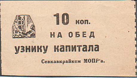 1930 г. Разм. 77 х 44 мм. Одноцветная печать на желтоватой бумаге. В центре текст в две строки: «На обед узнику капитала». Сверху номинал. Внизу текст: «Севкавкрайком МОПРа». В левом верхнем углу эмблема МОПР. По бокам знака вертикальные пунктирные разграничительные линии.