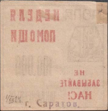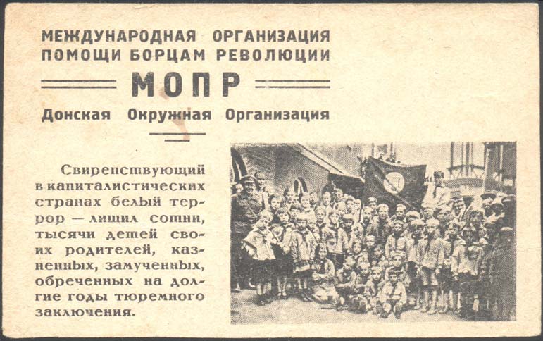 1930(?) г. Листок разм. 129 х 80 мм. Одноцветная печать на желтоватой бумаге. В левом верхнем углу текст в четыре строки: «Международная организация помощи борцам революции МОПР Донская Окружная Организация». В правом нижнем углу группа детей с флагом. Слева текст в десять строк: «Свирепствующий в капиталистических странах белый террор – лишил сотни, тысячи детей своих родителей, казненных, замученных, обреченных на долгие годы тюремного заключения».