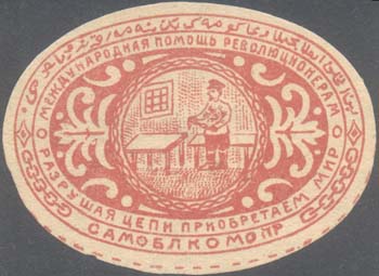 1924 г. 20.04.1924 г. Виньетка в форме овала разм. 60 х 40 мм. Одноцветная печать на плотной желтоватой бумаге. В центре тройной овальной декоративной рамке разм. 54 х 37 мм заключенный в тюремной камере. По периметру рамки текст на русском и узбекском (арабским шрифтом) языках: «Международная помощь революционерам. Разрушая цепи приобретаем мир. Самоблкомопр».